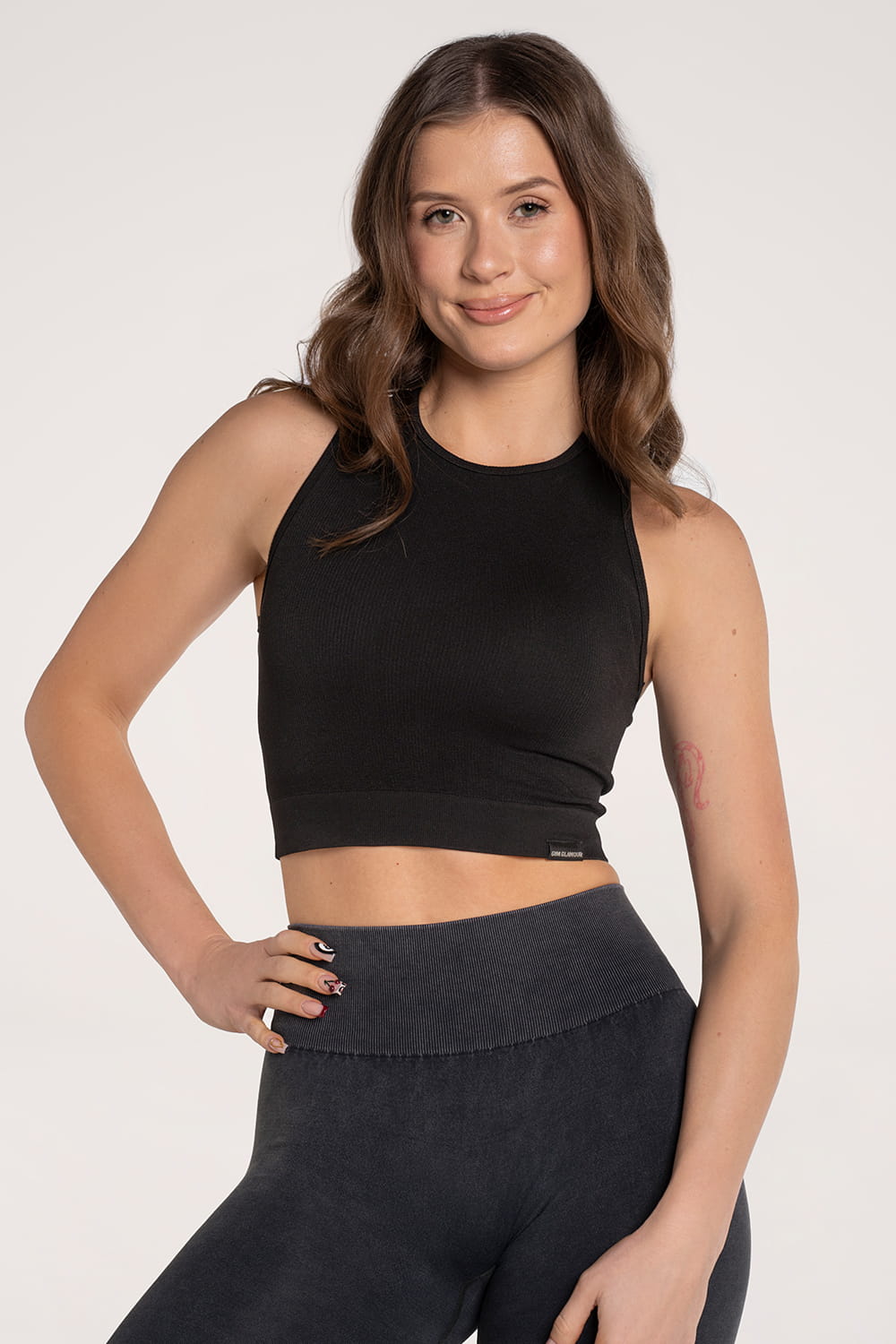 - Klasszikus top, minimalista Gym Glamour logóval, amely címke formájában jelenik meg.