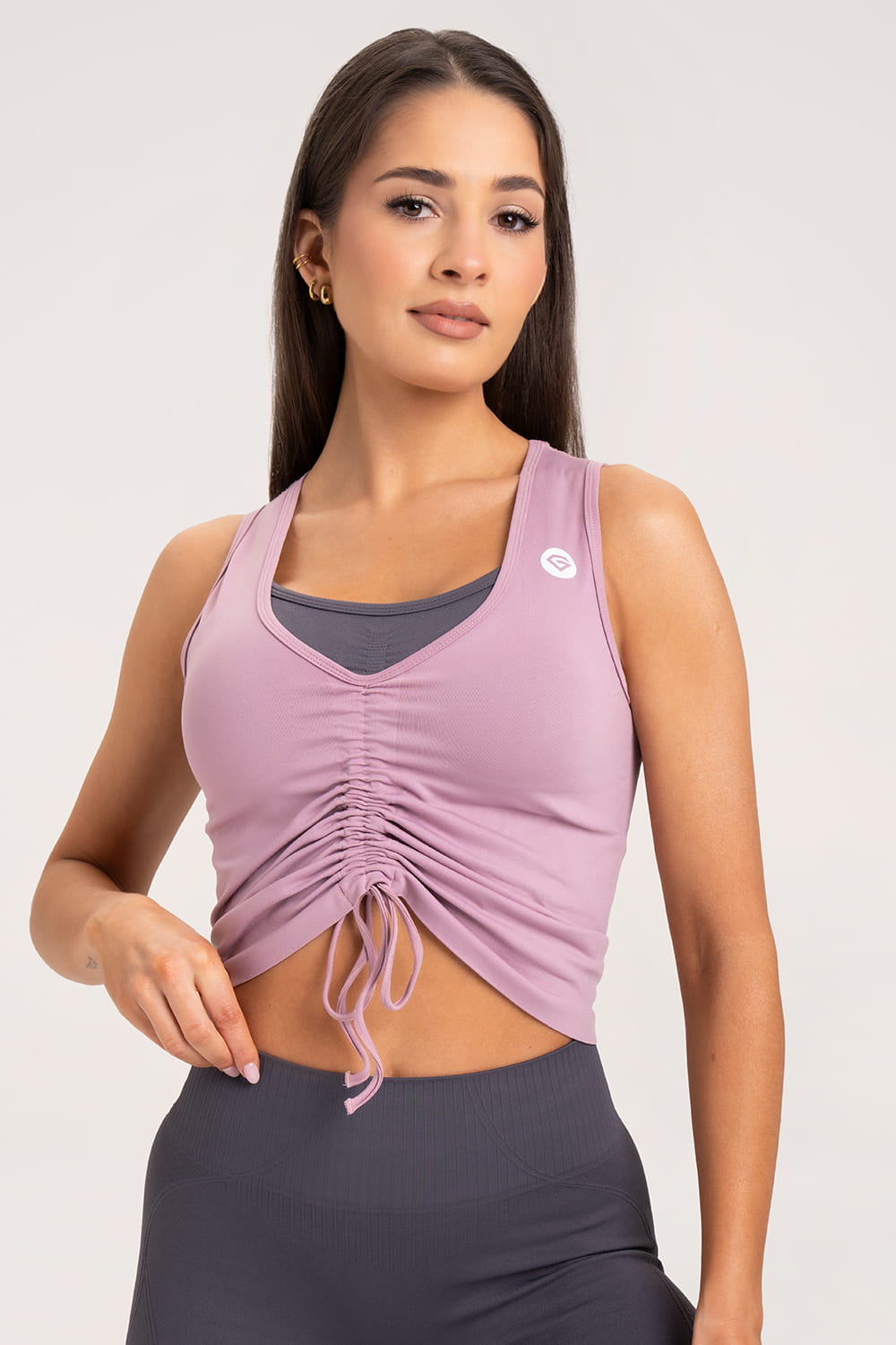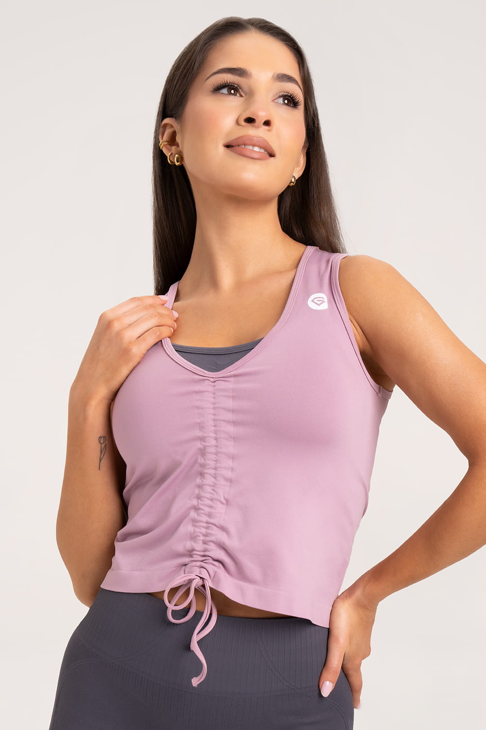 A felsőt kétféleképpen lehet viselni. Leengedve eltakarja a hasat, és lehetővé teszi, hogy mozgás közben kényelmesen érezd magad. Az alján lévő két húzózsinór lehetővé teszi, hogy a topot a köldök fölé húzd, így trendi gyűrődést kapsz, ahogy a képen is látható.