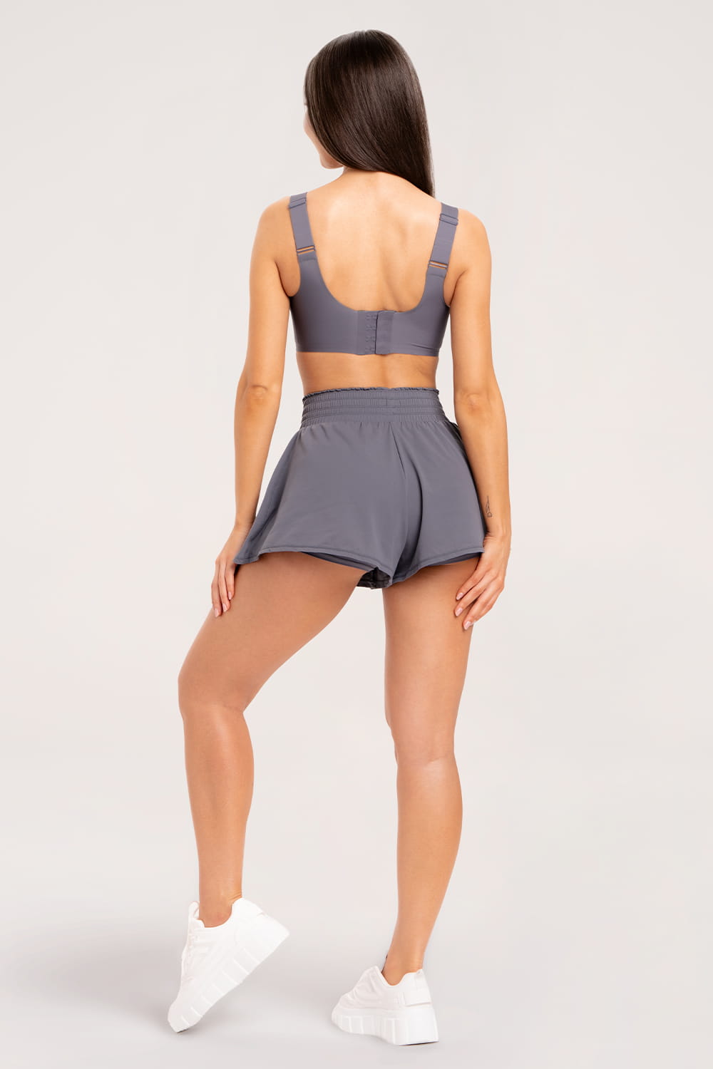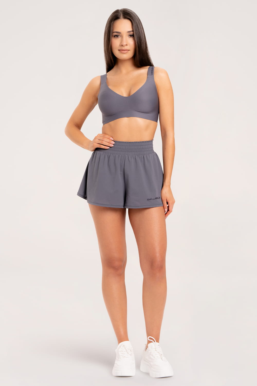 Kétrétegű rövidnadrág, amely egyszerre stílusos és kényelmes. A külső, bő szabású, könnyed anyag légies megjelenést kölcsönöz, míg a testhez simuló, praktikus belső biciklis nadrág – beépített telefontartó zsebbel – teljes mozgásszabadságot biztosít. A derékrészen rugalmas gumipánt és állítható megkötő gondoskodik a tökéletes illeszkedésről. A nadrágot finom, áttetsző, enyhén fénylő logó teszi teljessé.
